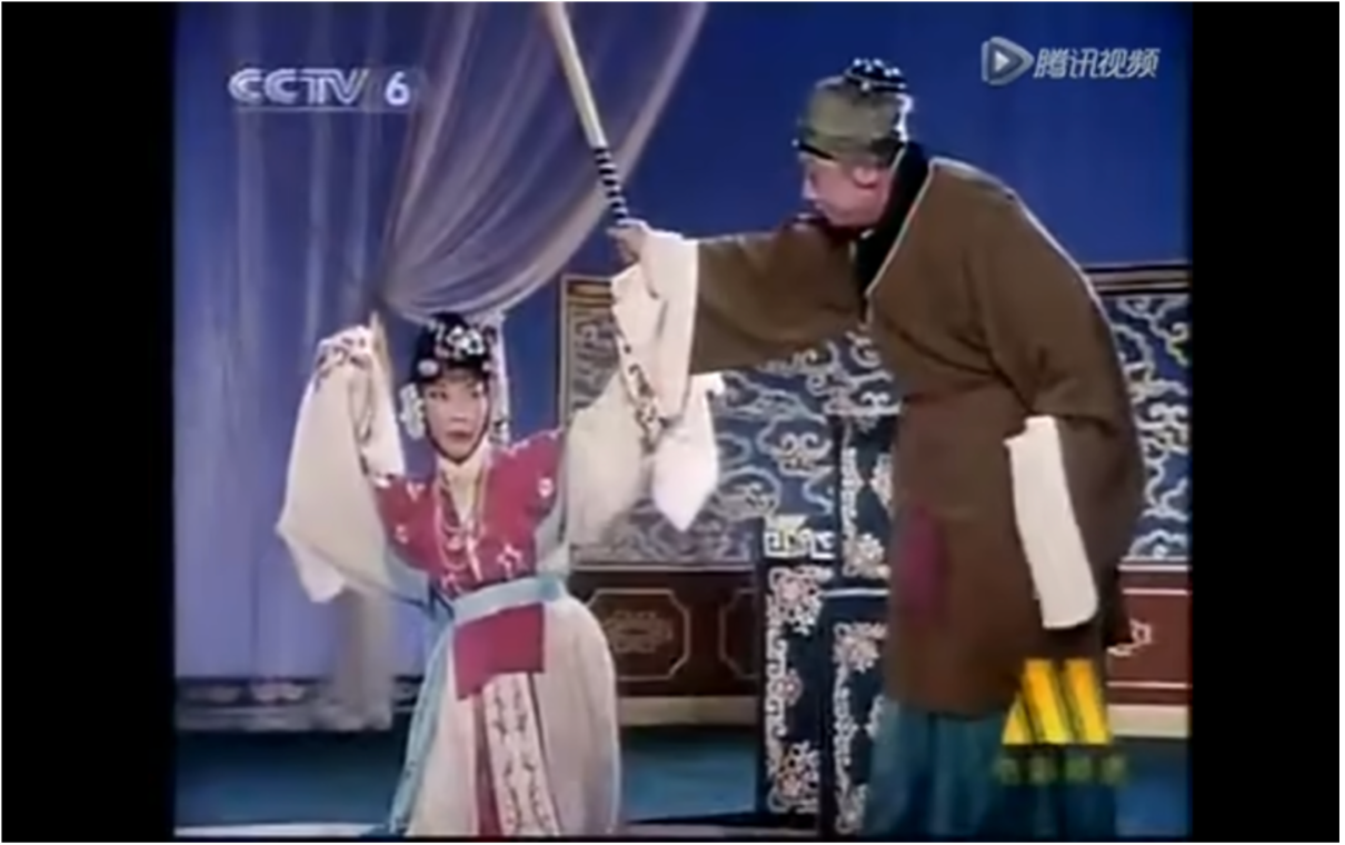 Before Hongniang can take the lead as the film’s revolutionary hero, it first establishes the reactionary villainy of Madam Cui. Madam Cui is not considered a main role in any version of The Western Wing, but Crimson takes pains to diminish her into a flat character, who comes off as old fashioned, bitter, and unscrupulous. Midway through the film, Hongniang comes to occupy the role of the main character; meanwhile, the movie utilizes Student Zhang’s role as a sort of sidekick to Hongniang. In doing so, it demonstrates some class solidarity through the student and worker collaborating to overcome the tyranny of the old culture as embodied in Madam Cui. As a result, Student Zhang and Yingying’s romance is minimized in favor of showing the development of Hongniang and Student Zhang’s relationship as they work together toward that goal. The amount of time the plot spends on this duo also conveniently cuts down the amount of screen time available for some of the original romance that made The Western Wing controversial long before the 20th century. Keenly aware of the accusations of performing “yellow content” that had previously been levied against her in the 1950s and 1960s, Zhao Yanxia knew how to be very guarded when acting the potentially suggestive role of Hongniang (Liu 2021).Scene 1: Madam Cui: The Unsympathetic Widow