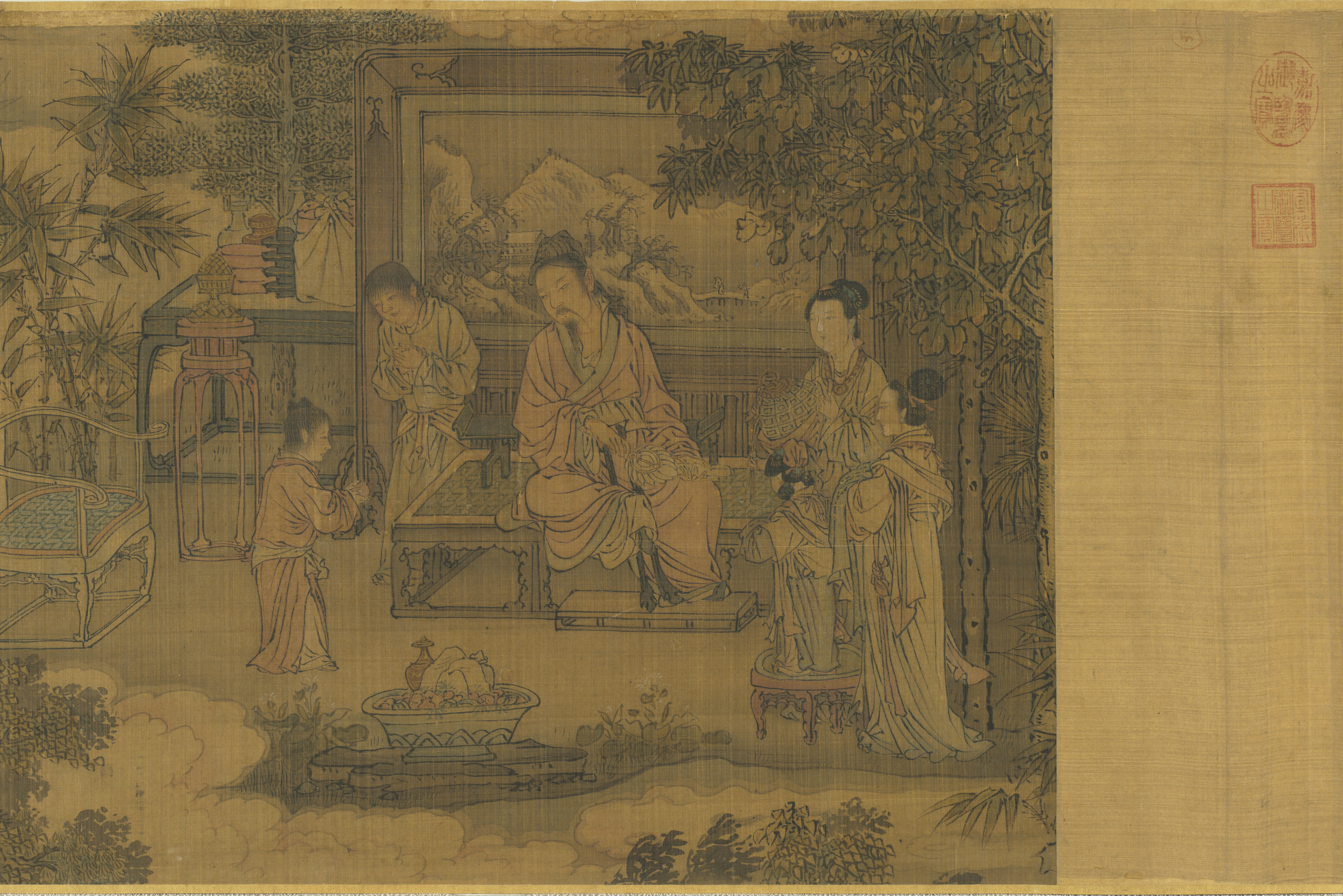 Importantly, filial love was not an abstracted feeling, but it manifested in acts of care, especially the attention lavished on the provision of food, medicine, and funerary practices for the older generation. For example, in the Yuan-dynasty painting “Four Paragons of Filial Piety” (“Sixiao tu” 四孝圖) (see fig. 1), four stories about men and women illustrate different acts of filial sacrifice: a daughter-in-law cuts off pieces of her thigh bone (gegu 割股) to cure her ailing mother-in-law; one son travels afar to provide the oranges that his mother favors; another goes ice-fishing to aid in the recovery of his sick mother; and a woman jumps into a river and searches for three days to retrieve the corpse of her drowned father. Amidst these stories about children going to extremes to attend to their elders’ physical welfare, Mulan’s story is unusual in that it allows the heroine not only to assume a male guise, but takes her beyond the confines of her household. In short, filial love meets martial arts adventure story and for good measure is topped off with a marriage.