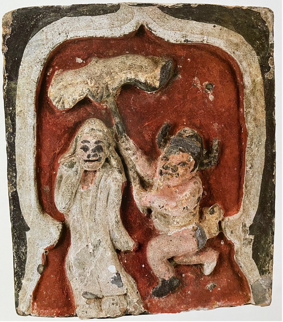 Upon her arrival at Zhou She’s residence in Zhengzhou, things turn out even worse than Pan’er had predicted. As Yinzhang laments: “No sooner had I entered the gate than I was given fifty strokes of the cane . . . Good heavens! You will beat me to death!” (642). In earlier skits (yuanben 院本, shehuo 社火), physical altercations between men and women often had comic overtones (see Fig. 3), but in keeping with the newfound seriousness of zaju theatre, in Guan’s play, such violence was no longer simply a comic device to entertain audiences. Instead, the play portrays the horror of being on the receiving end of physical brutality. Certain that she will die at the hands of her abuser, Yinzhang swallows her pride and secretly sends a missive to her mother describing her plight and pleading for Pan’er’s help:
