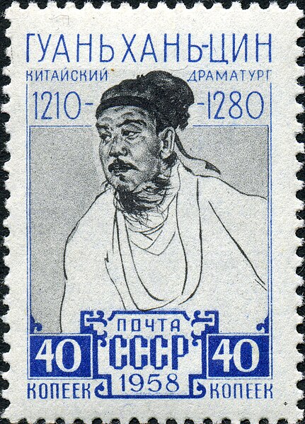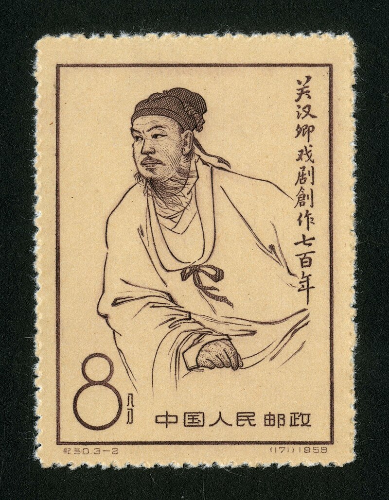 In the twentieth century, Guan Hanqing’s name served to facilitate the entry of China into the canon of world theater. For one, Guan was dubbed the “Chinese Shakespeare” to denote his seminal position within China’s theatrical corpus, while elevating his stature both within China and beyond. For another, he was pressed into the service of various causes of modern nation-building. Importantly, Guan Hanqing’s so-called “natural style” (ziran 自然)—a tribute to his capacity to blend different linguistic registers--was now assimilated to the new idea of “realism” (xieshi 寫實), thus ushering in the possibility of reading as his plays as pointed social criticism and political allegories. Such efforts culminated in the week-long celebrations of Guan Hanqing’s 700 year anniversary in 1958. Not only were symposia, exhibitions and revivals of his plays orchestrated in the capital of Beijing, but over fifteen hundred theater companies across the country were said to have adapted and staged his plays, while national and local radio stations broadcast special programs devoted to Guan (Sieber, Theaters of Desire, 37-40). A commemorative stamp with an invented likeness of Guan Hanqing was issued, marking the moment when a relatively obscure Yuan dynasty playwright was transformed into a household name in China (Fig. 3) and abroad (Fig. 4).