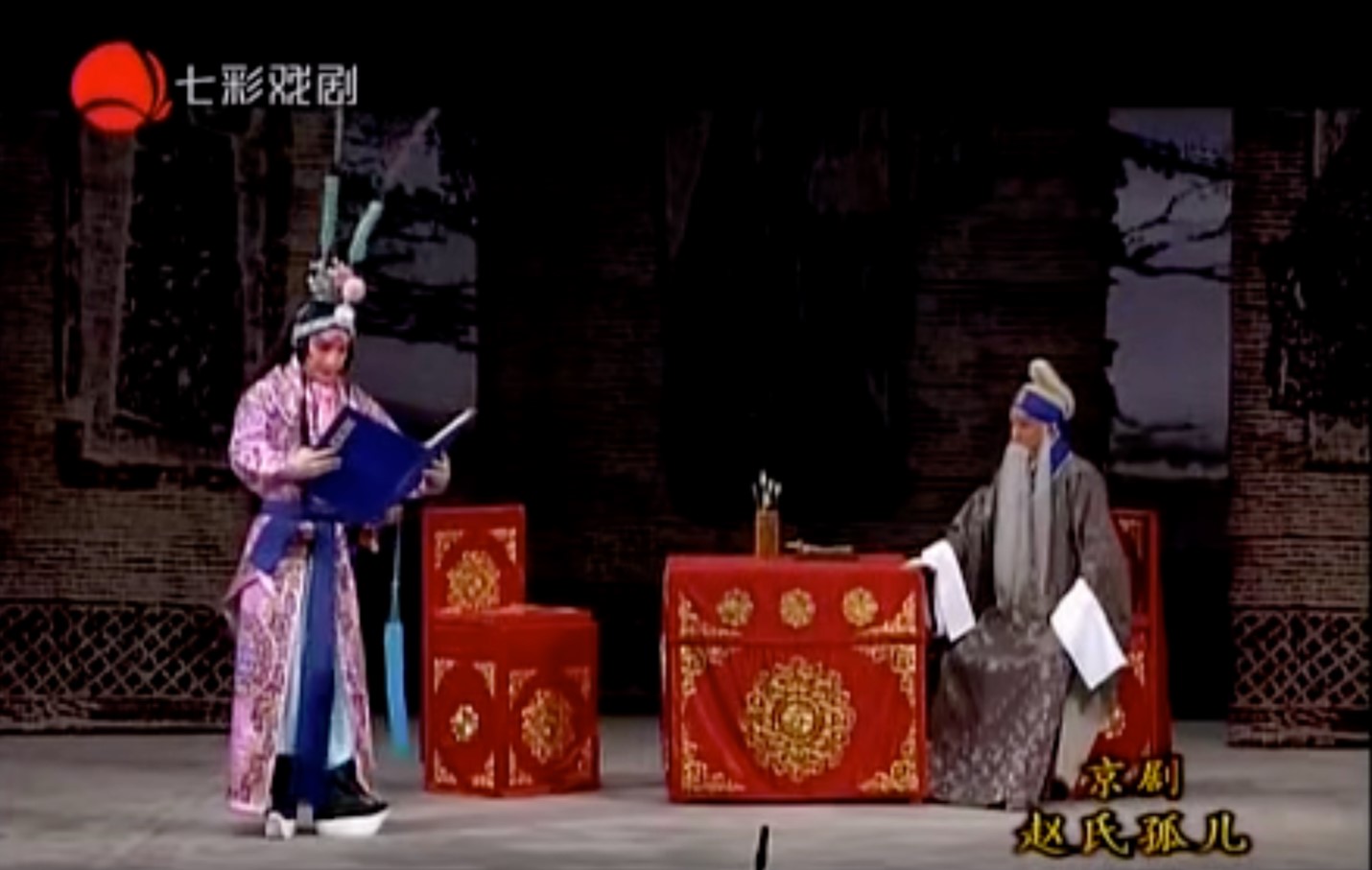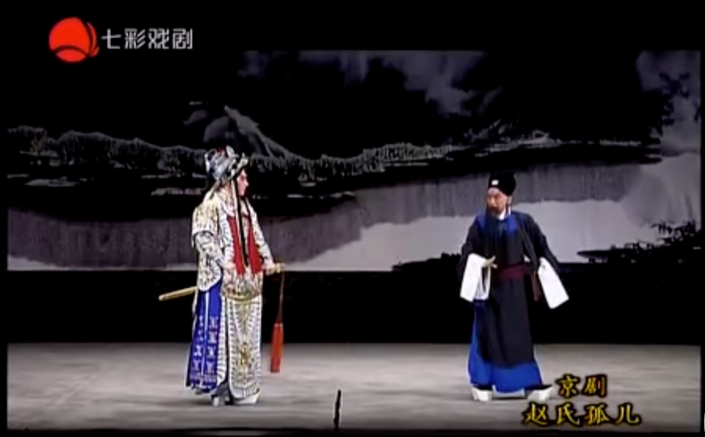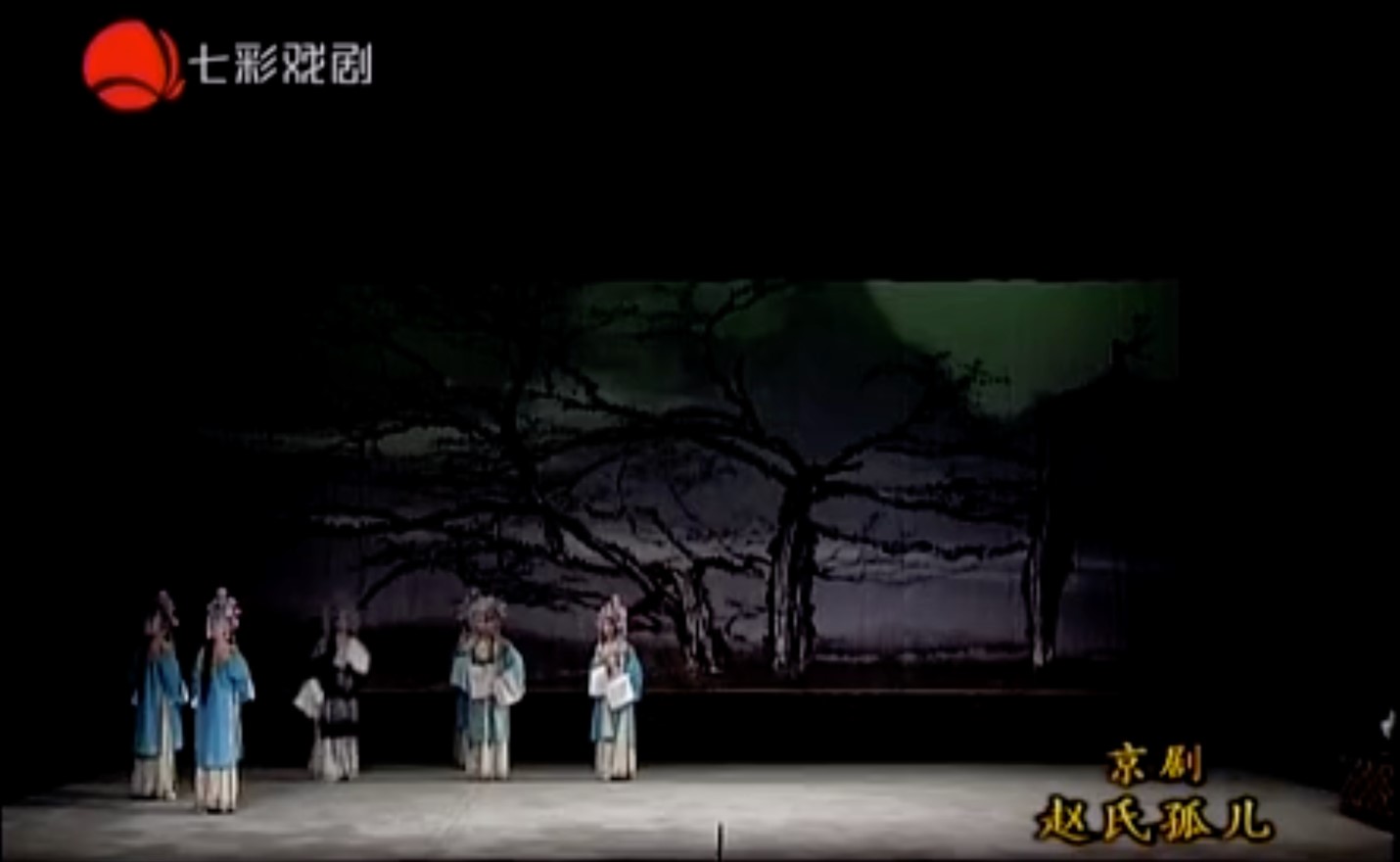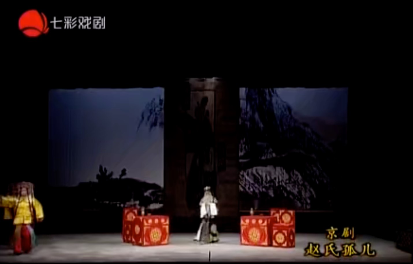 Based on Ma Lianliang’s performance script, the “Ink and Vermilion” edition made few textual changes, but rearranged the order while removing some arias. The renowned traditional Chinese painter, Shen Shihui 申世辉 (1959-), was invited to paint a series of landscape paintings specifically for this edition. The name “Ink and Vermilion” stands for the original script by Ma Lianliang (ink) and Shen’s painting (vermilion) respectively. While the stage design retained the most traditional elements of Peking opera, featuring the classic “one table and two chairs” prop arrangement, some modern adaptations were made: in front of the background curtain, seven antique-style figure paintings, depicting the main characters in the Orphan, would be slowly raised or lowered from the ceiling of the stage in accordance with the storyline. These paintings provide a visual enhancement to the narration and the theatrical presentation.