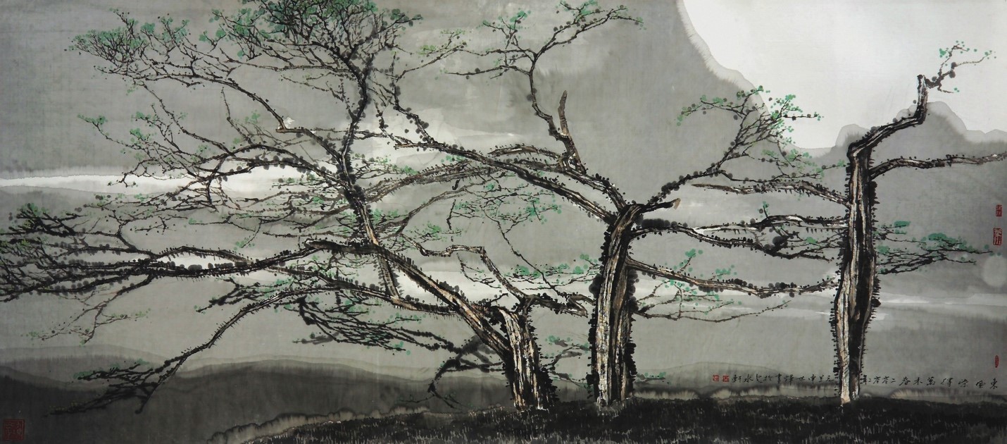 Interestingly, the producers of the “Ink and Vermilion” rendition commissioned Shen Shihui, the famous Chinese painter, to create three ink-wash paintings to serve as background images for the performance. Shen Shihui is known for landscape paintings; hence, all three paintings unsurprisingly depicted nature and took landscape as their main subject.
