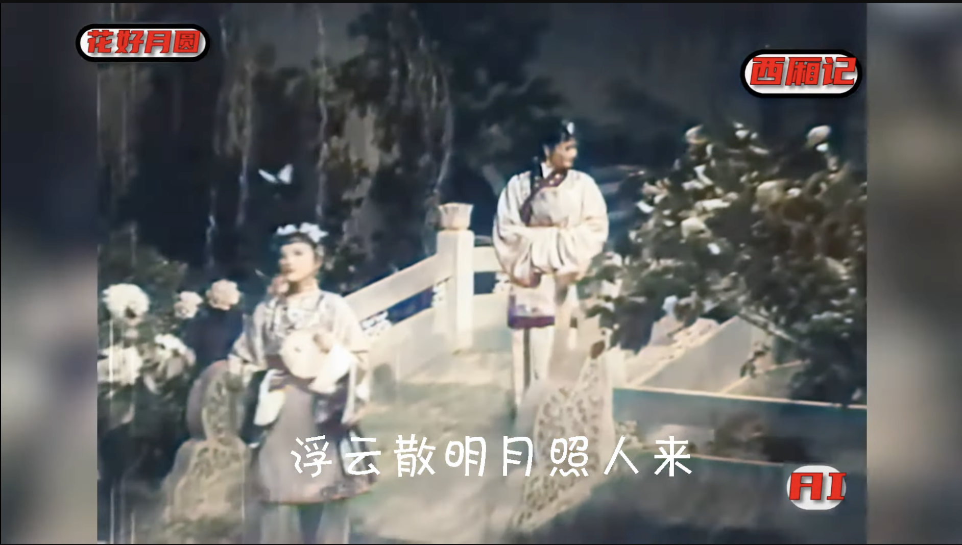 Hongniang’s lost song has likewise been resurrected by another nostalgic internet trend, namely, AI restoration. Various restored versions of Zhou Xuan’s voice exists online, this clip on YouTube is an instructive example. In addition to offering a crisp rendition of the original song (all the record’s sound artefact removed), the video includes AI-colorized footage from the film. It is a familiar scene, the moments in the garden when Hongniang sings the “Butterfly Tune.” The video even includes subtitles to the song’s lyrics that replace the original lyrics visible in this scene with the new song. Though not copied exactly, the new font even echoes the handwritten characters original to the 1940s film (see fig. 12 & fig. 13 for comparison).