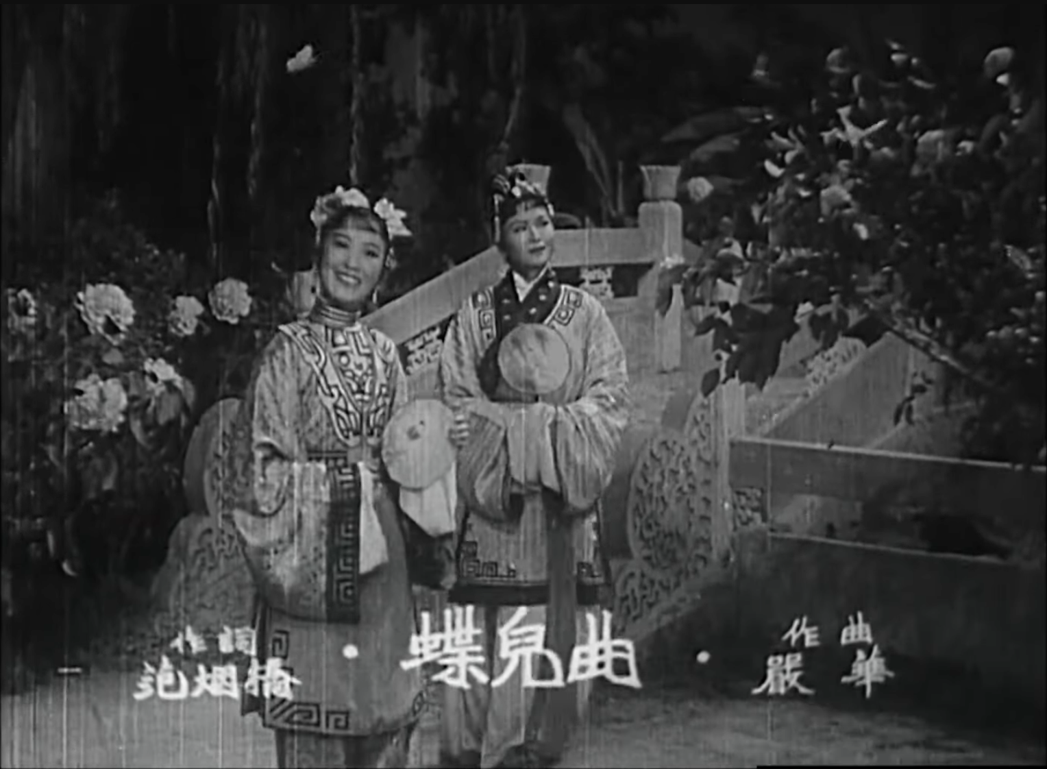 The 1940 Western Wing film was a media event, a “mega production” (juzhi 巨制 ) that featured musical performance, elaborate sets, and rich costumes. Although multiple actors sing throughout the film as they would in a Chinese opera film, this Western Wing represents a blend of the “opera film” (xiqu pian 戲曲片) and the “musical film” (gechang pian 歌唱片) genres. “Modern song” (shidai qu 时代曲) musical numbers are interjected into the narrative as they are in Hollywood musicals, popular in China throughout the 1930s, but characters also deliver lines of dialogue in song. Whenever characters break into song, the symbiotic relationship between cinema and the music industry is underscored visually: the title, lyricist, and composer of each song appears on screen. Such film songs are literally called “interjected songs” (chaqu 插曲) and function as moments of musical pleasure as well as narrative supplement. The film’s first chaqu, for example, is “The Butterfly Tune.” The song’s title and credits appear on screen just before Zhou Xuan, as Hongniang, prompts Yingying to look at the butterflies in the garden and begins singing (fig. 2).