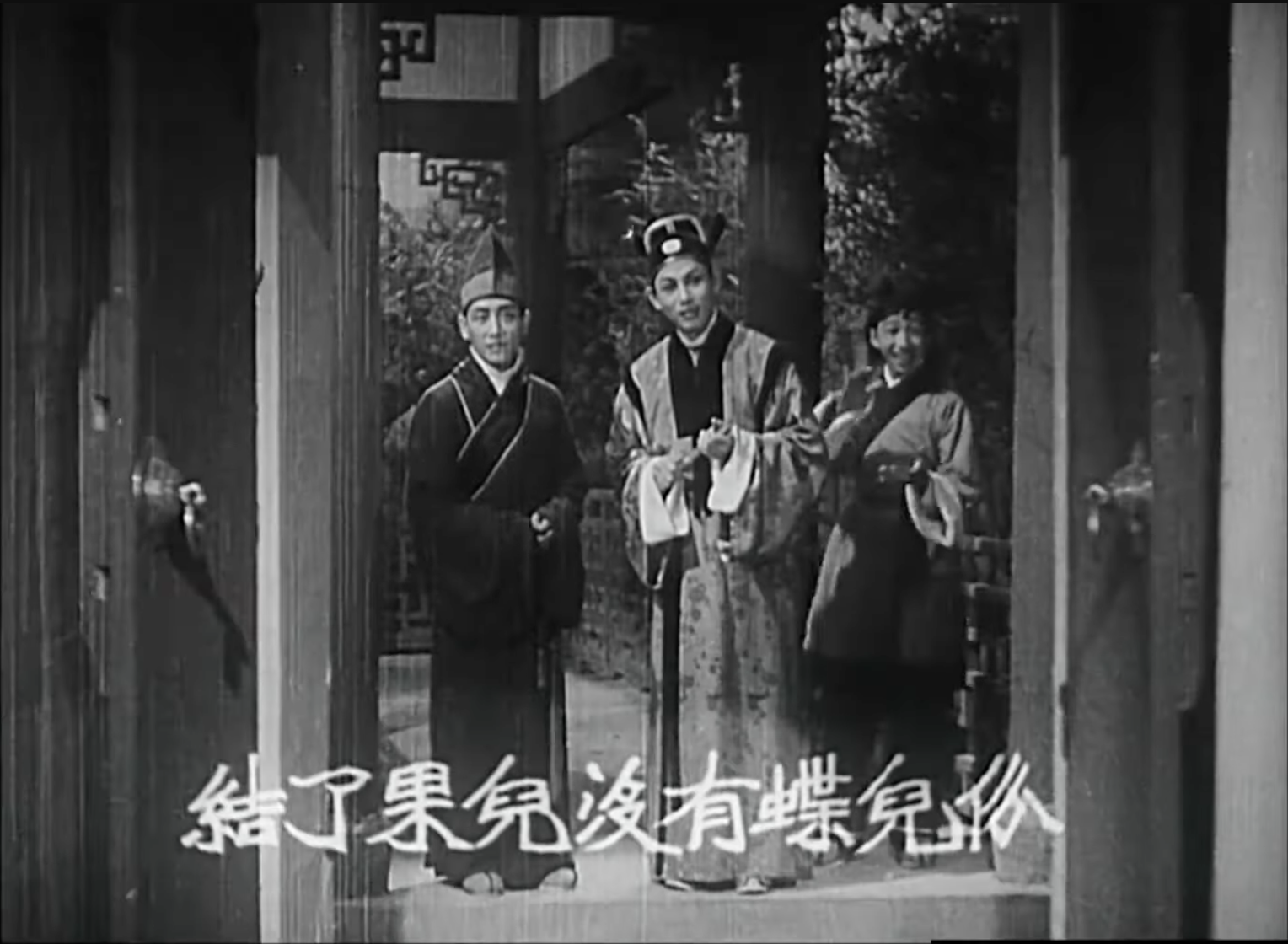 Zhou Xuan’s performance does a lot of work in this scene. She is foregrounded as a singer at the beginning of the story, a move that engages the audience through her celebrity status. While Student Zhang is clearly staring at Yingying (the shot-reverse-shot film grammar makes his point of interest obvious), when he discusses the women with the monk Facong after the women leave, he first asks about the identity of the singer. Yingying may be lovely to look at, but Zhou Xuan’s voice is given priority even in the dialogue. Within the film’s diegesis, the song introduces Hongniang the maid as a crucial musical and visual mediator between the lovers. The butterflies in her song lyrics give us a first clue—like the butterflies that bring together pollen and flower, Hongniang’s actions enable coupling, i.e., the union of the film’s two lovers. The song’s note of frustration that this work is not appreciated and its final question, “Who knows your heart?” suggest that Hongniang is not entirely happy with her subordinate role. Jean Ma writes of the function of song in the Chinese musical film: “The songstress anchors a representational system in which speech must periodically give way to song, allowing the female voice to come to the fore as a locus of dramatic and affective intensity” (6). In this scene, the dramatic intensity cuts two ways: it highlights the budding romance between Student Zhang and Yingying, while calling attention to Hongniang as a mediator who ultimately remains outside the romance.