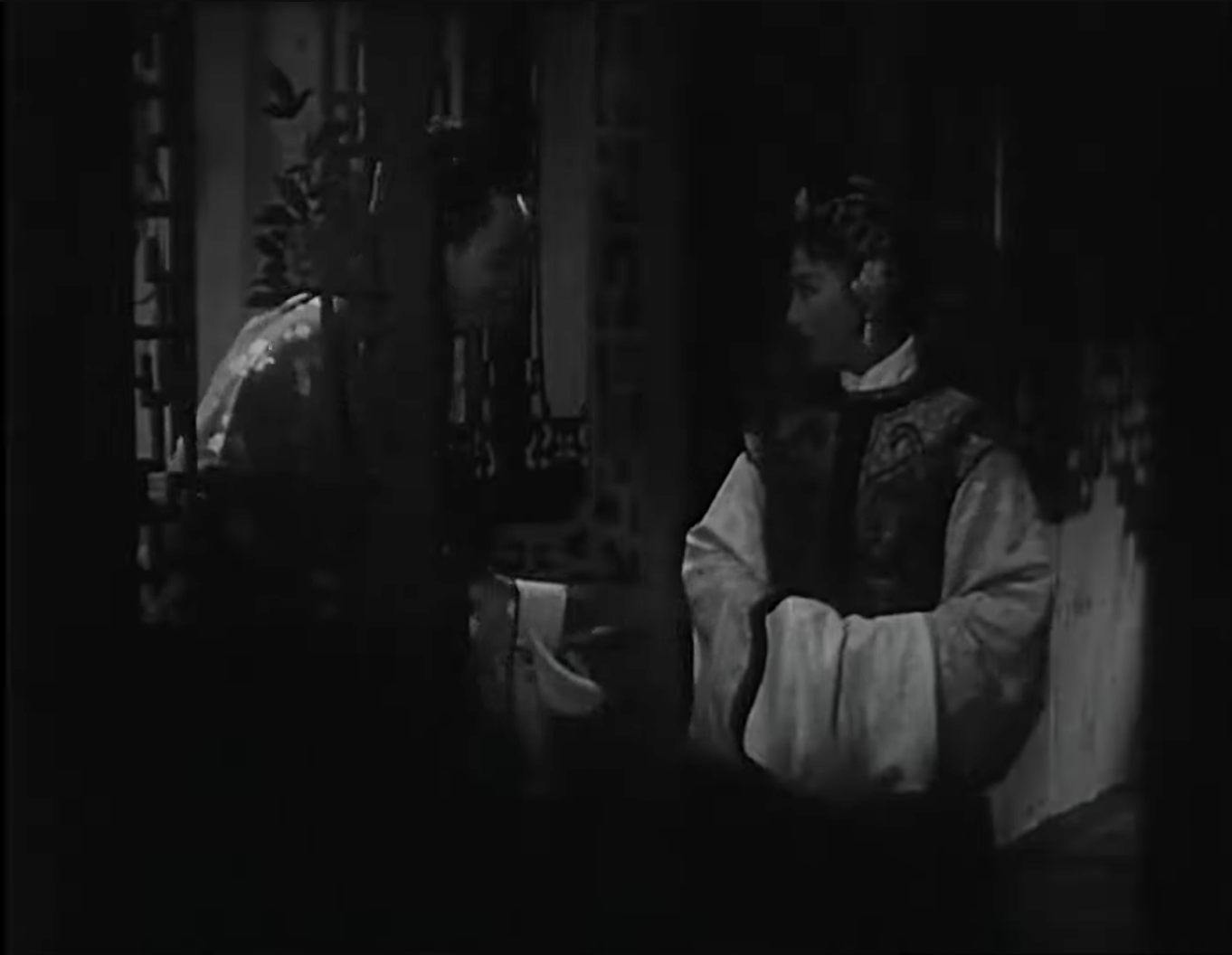Visually, the film likewise both relies on Hongniang and displaces her. In the shots above (fig. 6 & fig. 7), she looks askance between Yingying and Student Zhang, becoming aware of the potentially scandalous chemistry between the two. This realization marks the moment as a significant one for the audience. It also occurs literally to the side of the two lovers’ eyeline match, leaving Hongniang just outside the romance that her song seems to have initiated (especially if we assume her singing voice attracted the men to the garden in the first place).